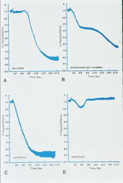 Aggregation begins when platelets undergo a shape change from discoid to spiny sphere, exposing fibrinogen receptors