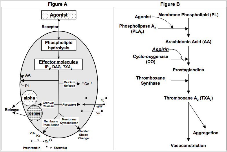- anti-plt effects through selective irreversible inhibition of plt cyclooxygenase (COX-1), an in the TXA2 cascade that causes plt activation and vasoconstriction