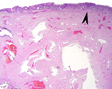 Rectal angiokeratoma. Note the dilated vascular spaces present within the squamous epithelium