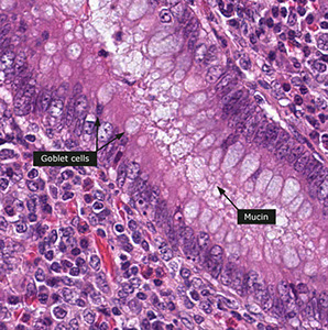 1) Goblet cells shaped like goblets :) Mucin composition not fixed. Nuclei appear dark, dense, misshapen