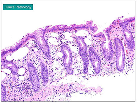 -- Mononuclear cells in lamina propria in R > L colon (verify biopsy site before calling IBD)... know where bx is from!!!