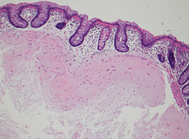 - subspithelial tissue c bizarre MNGCs and mast cell infiltrates
