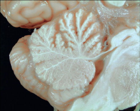 The anterior portion of the vermis (upper portion of figure) is atrophic with widened spaces between the folia