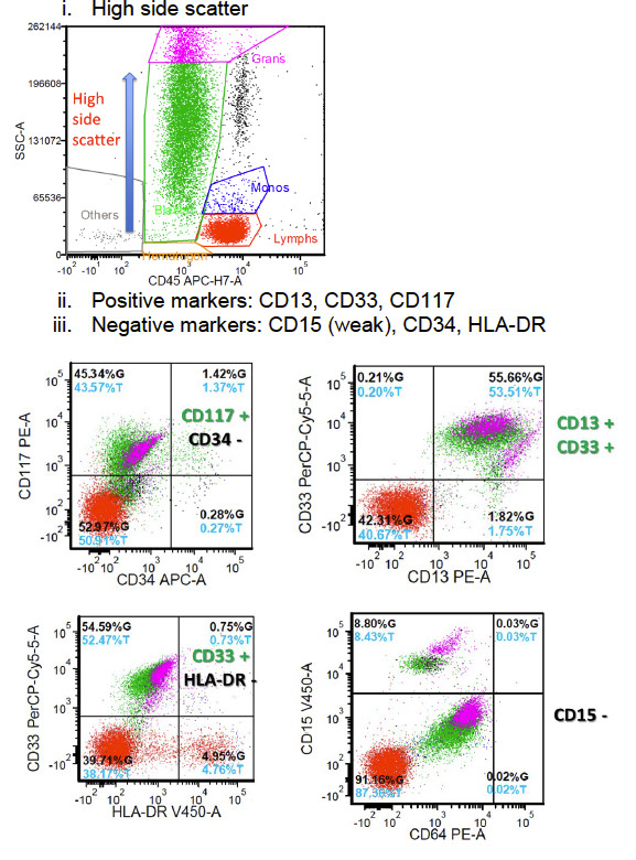 - negative CD15 (weak), CD34, HLA-DR