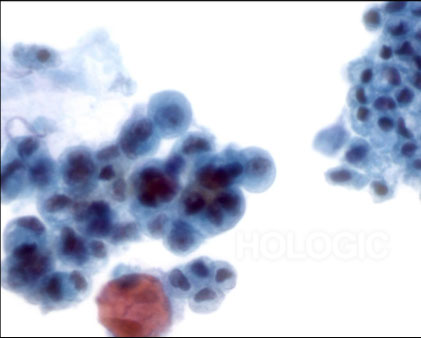 Micro: large hyperchromatic nuclei, prominent nucleoli, poorly preserved cytoplasm that is variable in amt