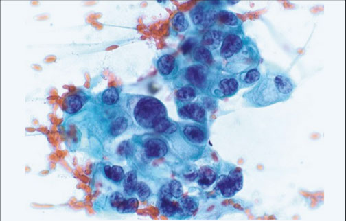 Sheds lots of diagnostic cells c very scanty cytoplasm, prominent nucleoli, coarsely clumped chromatin, irregular thick distinct nuclear membrane