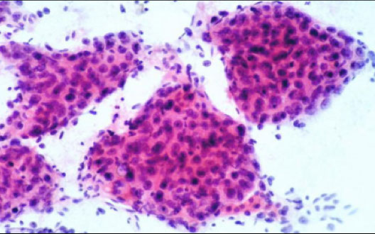 The aspirates show single and dyshesive clusters of neoplastic cells