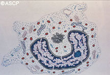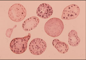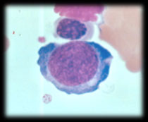 CD Markers-CD45RA; Size: 10-18 µm (close to a mature cell); N:C ratio 2:1; Nucleus may be eccentric (less golgi) but is more clumped, less red more blue; No / rare nucleoli (less mitoses); Cytoplasm clear to bluish-pink (still some RNA activity)c 20 granules appear; Specific to N, B, E