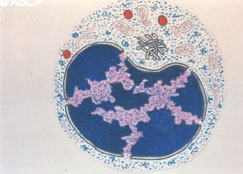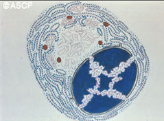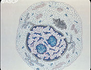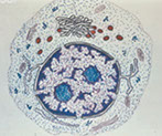 - size: 13 microns, low NC ratio, coarse , clumped chromatin that's a little lighter than neutros, no nucleoli, large red-orange uniform granules
