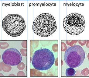 --- ie Myeloblast, Promyelocyte, Myelocyte, Metamyelocyte, band, granulocyte (N,E,B)