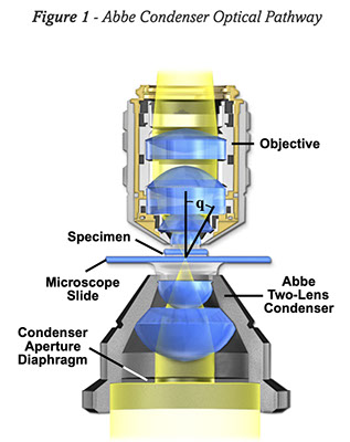 In a simple two-lens Abbe condenser. Light passing through the condenser is organized into a cone of illumination that emanates onto the specimen and is then transmitted into the objective front lens element as a reversed cone.