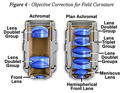 All three types of objectives suffer from pronounced field curvature and project images that are curved rather than flat, an artifact that increases in severity with higher magnification