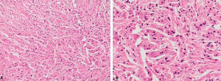 Micro: Large polygonal cells c fibrillar eosinophilic