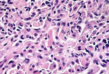 Micro: can have submucosal myxoid material c vascular stroma, fibrous tissue deposition, prominent dilated vascular spaces, and deposition of dense hyaline material / fibrin