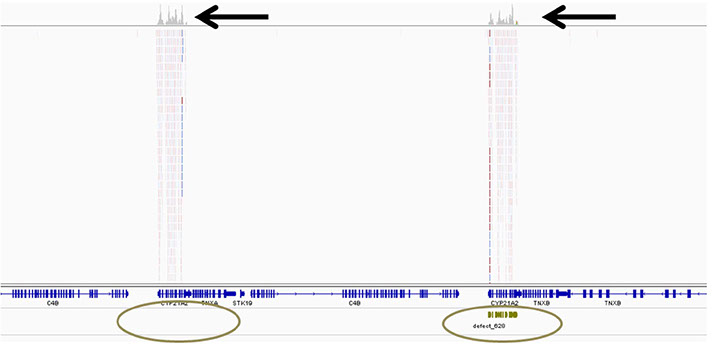 The right side shows the CYP21A2 gene with baits (Table 2) designed for sequence capture (green bars). The left side shows the CYP21A2 pseudogene without baits. A similar number of sequencing reads are being mapped to the pseudogene as to the real gene; since the reads are so similar the actual source cannot be determined. These reads would have a low mapping quality score, as the reads are mapping to more than 1