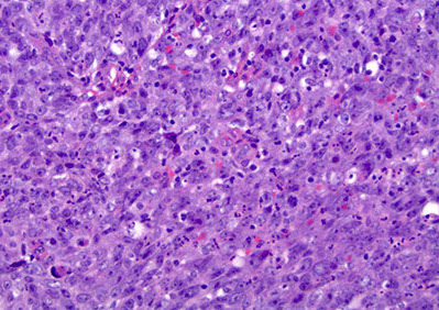 Embryonal: variegated hypo- and hypercellular areas. Cells round or spindled, hyperchromatic nuclei and may have bright eosinophilic cytoplasm (rhabdomyoblasts)