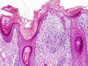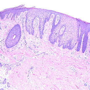 - epidermis usually has some atrophy c flattening of rete pegs