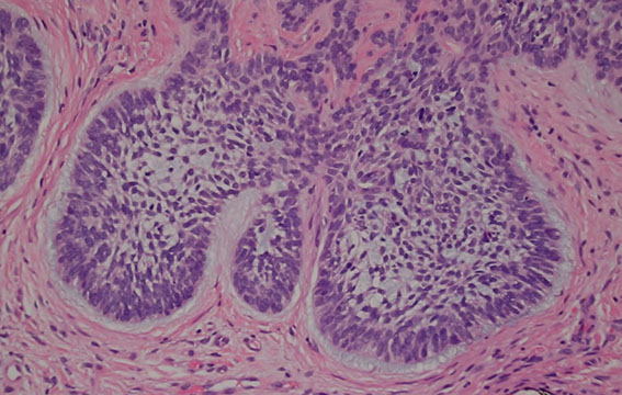Early - well circumscribed solid lobules of large pale sq cells c little keratinization; mild atypia and distorted follicular infundubuum