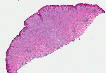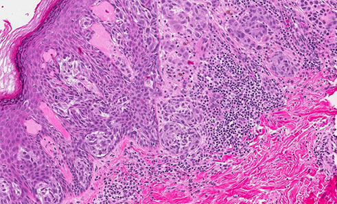 - also larger and more atypical squamous nests and islands c lots of lichenoid inflam and eos but no plasma cells; possible neutros microabscesses