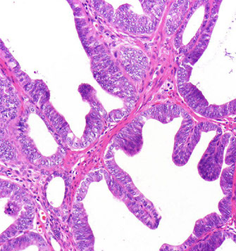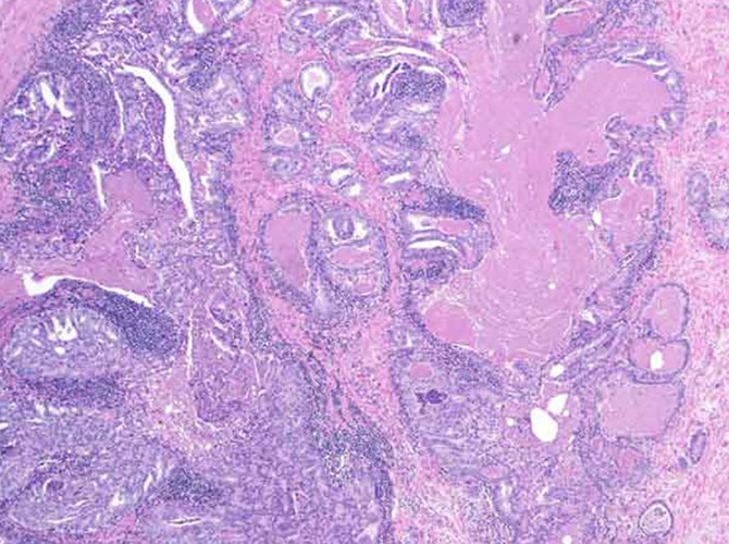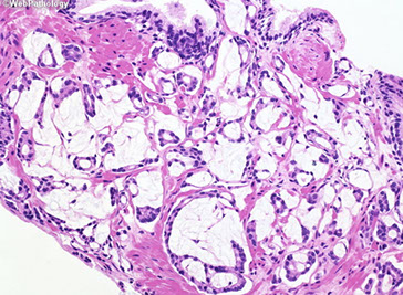 - glandular part made of small and large acini, some c papillary infoldings and projections c central fibrovascualr core (not a specific finding)