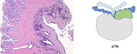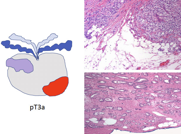 - extension into preprostatic fat, seminal vesicles, muscle of bladder neck