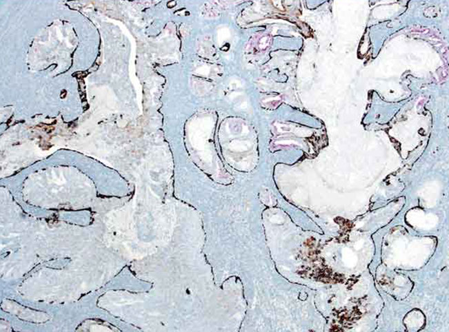 IHC: (+) HMWK (1/2+, so don't exclude if neg), CK7 (cytoplasmic, not very spec), PSA/PSAP (in 1/2, usually at least focally +), AMACR coupled c neg p63 (3/5, may mistake as prostate ca), PAX2 and PAX8 (due to origin from renal tubular cells, reliable marker to distinguish from prostate ca, which is neg)
