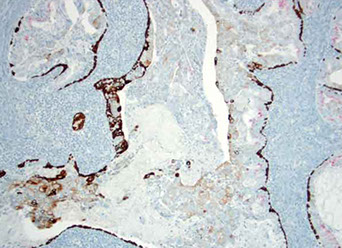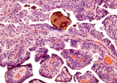 - vascular-like structures c attenuated epithelium +/- hobnail nuclei (structures stain as epithelial by IHC)