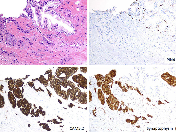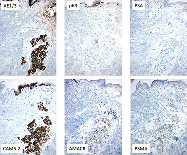 Nephrogenic adenoma: AE1/3+, p63+, PSA+, CAM5.2+, AMACR+, PSMA+