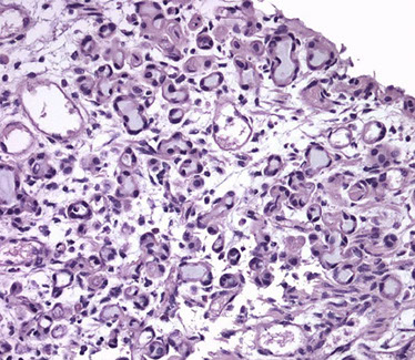 - often lymphocytic or plasma cell infiltrates around glands