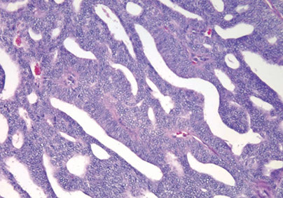 - anastomosing basaloid nests and tubules centrally lined c eosinophilic cells