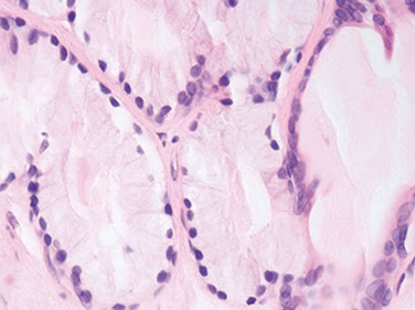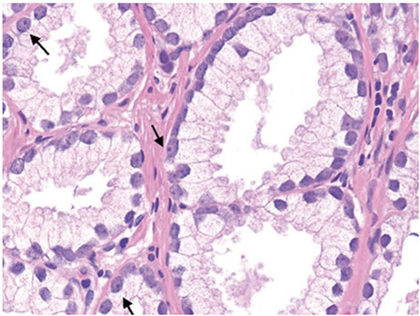 - basal cells are absent in adenocarcinoma of the prostate and can be found in conditions that mimic prostate cancer