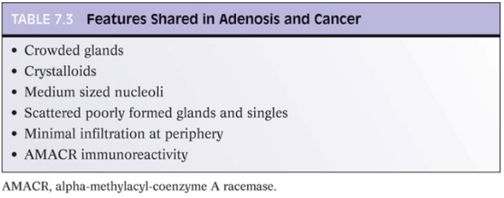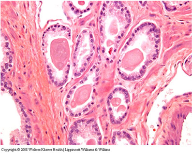 - corpora amylacea (round laminated hyaline eosinophilic or calcified structures) in 25% of glands in men 20-40 yo, and are rare in carcinomas