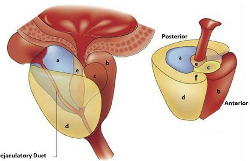 a) Central zone, b) Anterior fibromuscular stroma, c) transition zone, d) peripheral zone, e) periurethral gland,