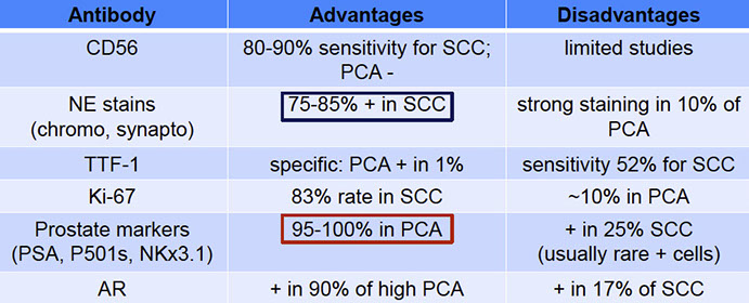 - micro: to dx must not have glandular differentiation, no prior hormonal tx, and lack of secondary involvement of the gland by bladder or urothelial SCC