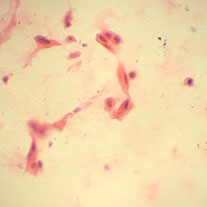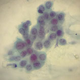 Mciro: Smooth cannon ball-like edge of cell clusters, or honey-comb sheets, papillae, acini; Nuclei are eccentric and round with finely granular chromatic and big nucleoli; cytoplasm is abundant, finely vacuolated (foamy) sometimes with large secretory vacuoles and arranged in small cell clusters or as single cells; (+) mucin vacuoles,