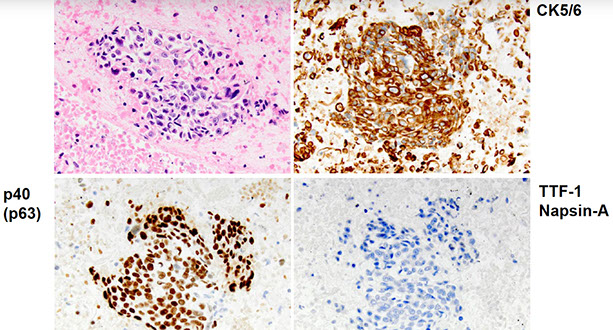 - adenoca has finer chromatin, more mucin and acinar formation, no keratinization and lighter cytoplasm than SCC