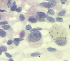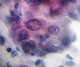 Micro: clusters or single cells c irregular nuclei, multiple prominent nucleoli, feathery cytoplasm, prominent chromatin clearing, inc mits