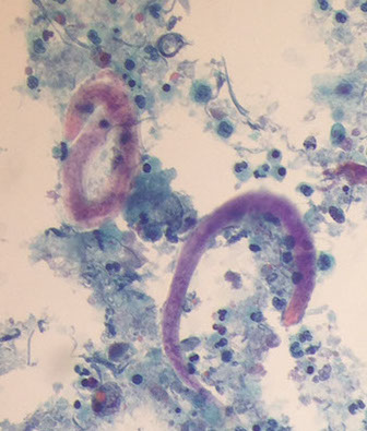 Sometimes called "asbestos bodies" are golden-black dumbbell-shaped thingies