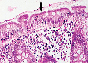 - should eval bx in systematic fashion, noting first above the epithelium for orgs (Giardia) or presence of mucus (inc in CF), then if brush border present, if there are intraepithelial inflam cells (rare lymphs are normal), then lamina propria (may see tumor in lymphatics)