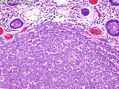 Endocrine cells also scattered in there, but rare; some lymphos too