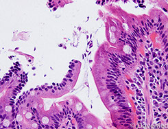 Villi: absorptive cell (columnar, eosinophilic cytoplasm) is major epithelial cell type found.