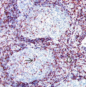 B-cells in follicles and sprinkled in interfollicular region