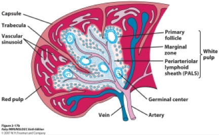 - secondary follicles pale and active c germinal center (where activated B cells proliferate after T cell activation) and mantle (with follicular dendritic cells [FDCs] that interact c mature B cells)