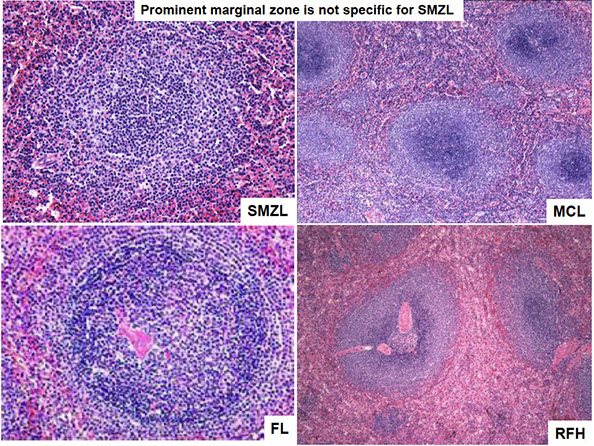 - Hyperplastic splenic marginal zones -- nonclonal , here, genetic studies are critical!!! (FCIPS/genotypic studies), splenic marginal zones can be very prominent in many types of benign spleens