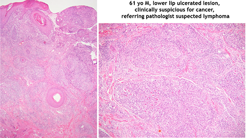 Marginal zone lymphoma in a mesenteric lymph node Left - follicles iwth GC, smaller mantle zone and paler peripheral zone, high mag (right) shows difficult to tell where mantle zone ends and marginal zone begins, bottom shows cells with pale cytoplasm and dispersed chromatin