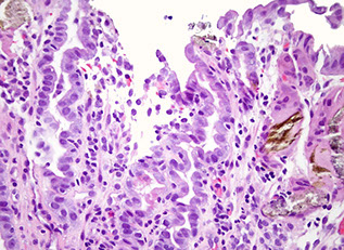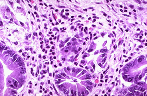 Micro: at low power, lamina propria expanded c small uniform cells, some of which have a "halo" around