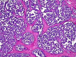 Micro: solid sheets of uniform cells surrounding gaping capillary vessels in HPC-like pattern