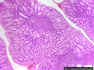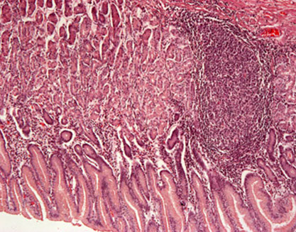 -- entry (cardiac) and exit (pylorus) tissue has lots of mucus glands, and has wider foveolae (villous appearance) and deeper foveolae (~50% of cariac/pyloric mucosal thickness) and lamina propria thick