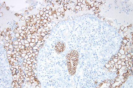 - tumor cells round c sharply defined cell membranes, round nuclei and delicate chromatin; can have bright red cytoplasm
