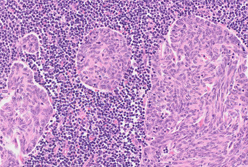 Micro: characterized by multiple, discrete solid nests or cords of tumor cells surrounded by abundant lymphoid stroma with lymphoid follicles